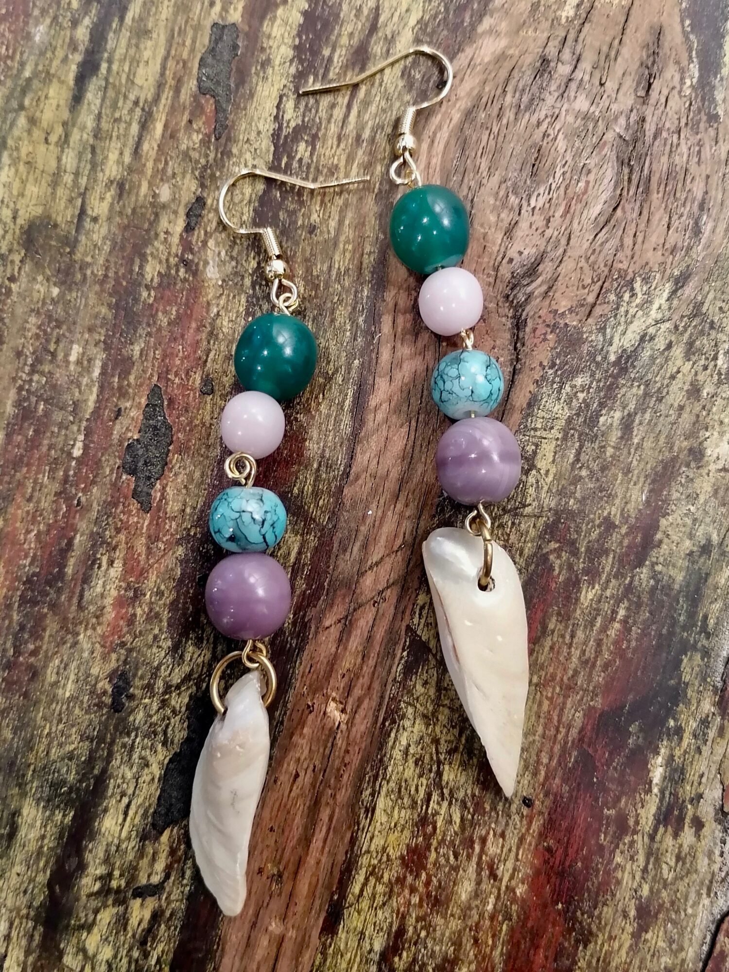 Hely medio -korvakorut on valmistettu lasihelmistä ja kierrätetyistä simpukoista ja koukut ovat kullattua kirurginterästä.