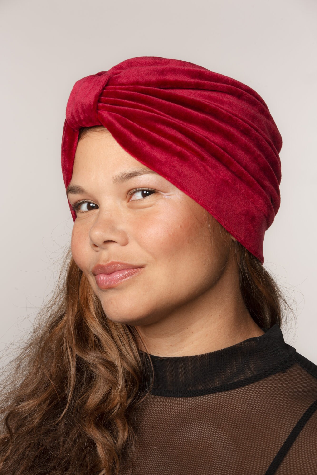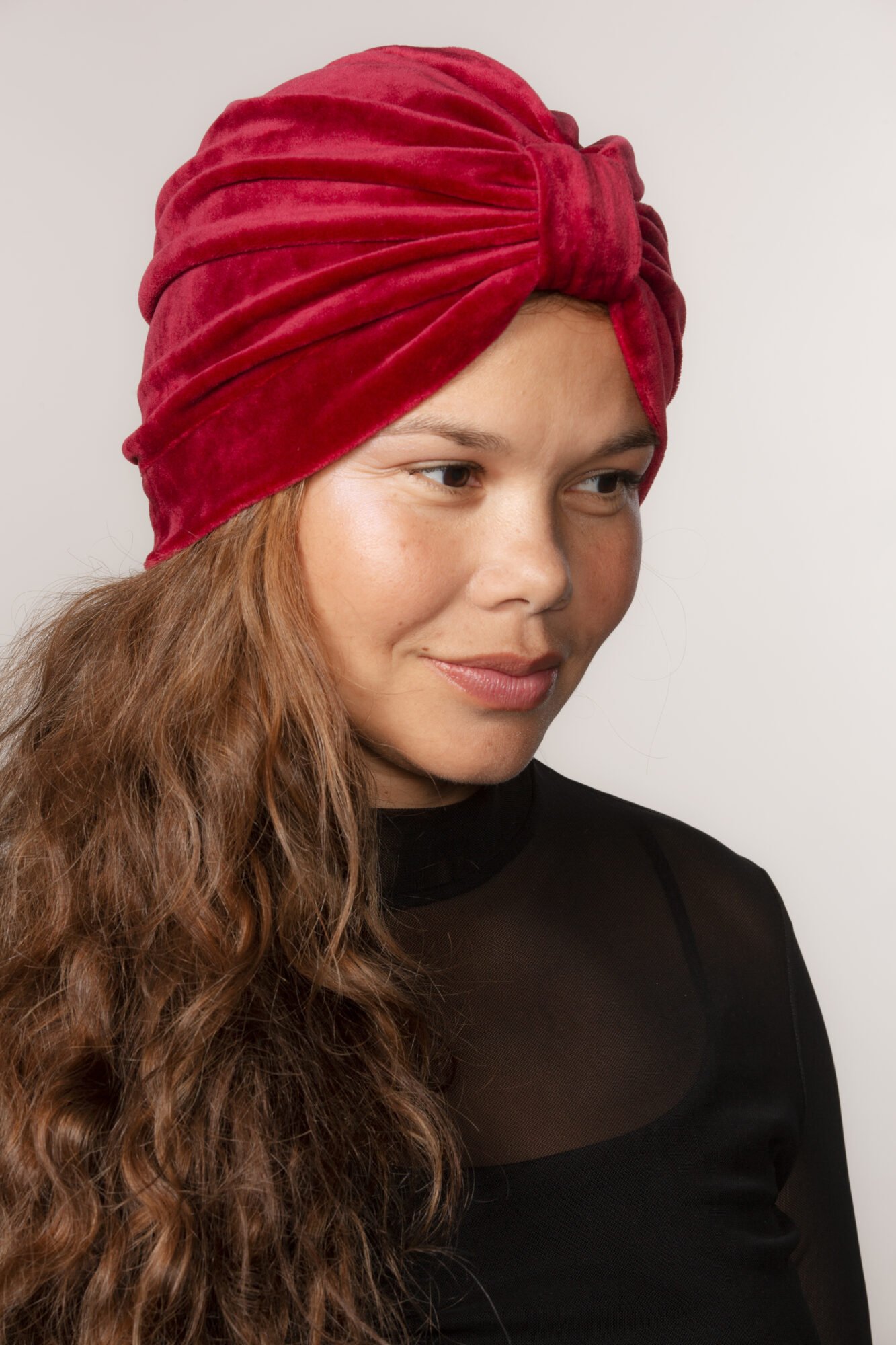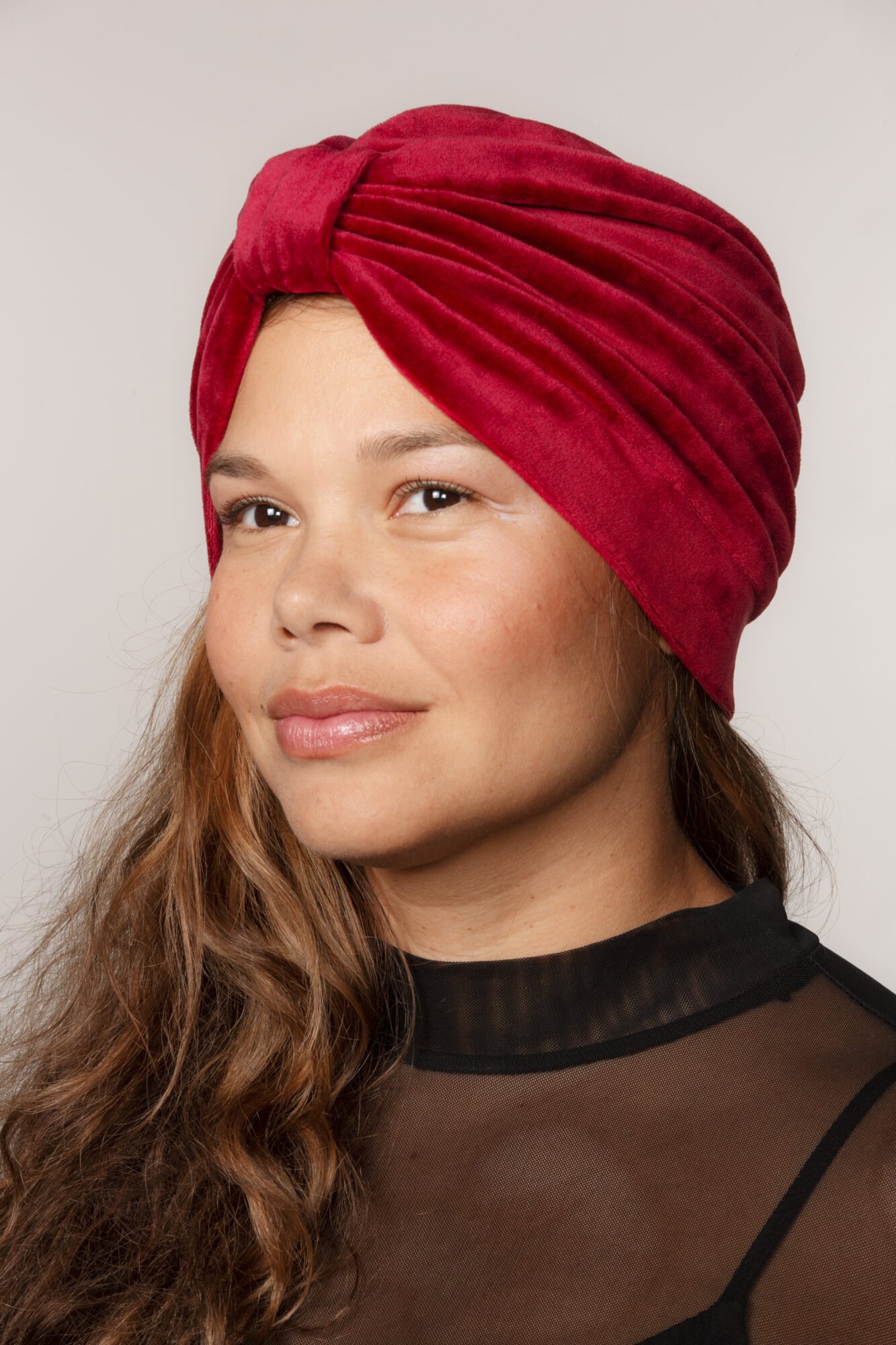 Ylellinen samettiturbaani kruunaa asusi! Turbaanin kangas on joustavaa veluuria Turbaanin takana on kauniit muotolaskostukset.