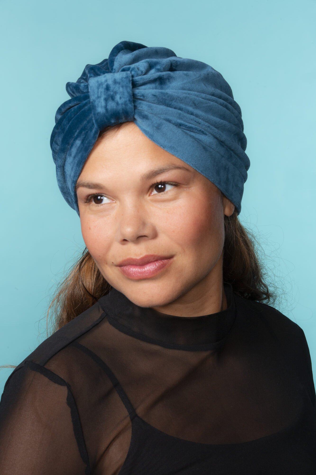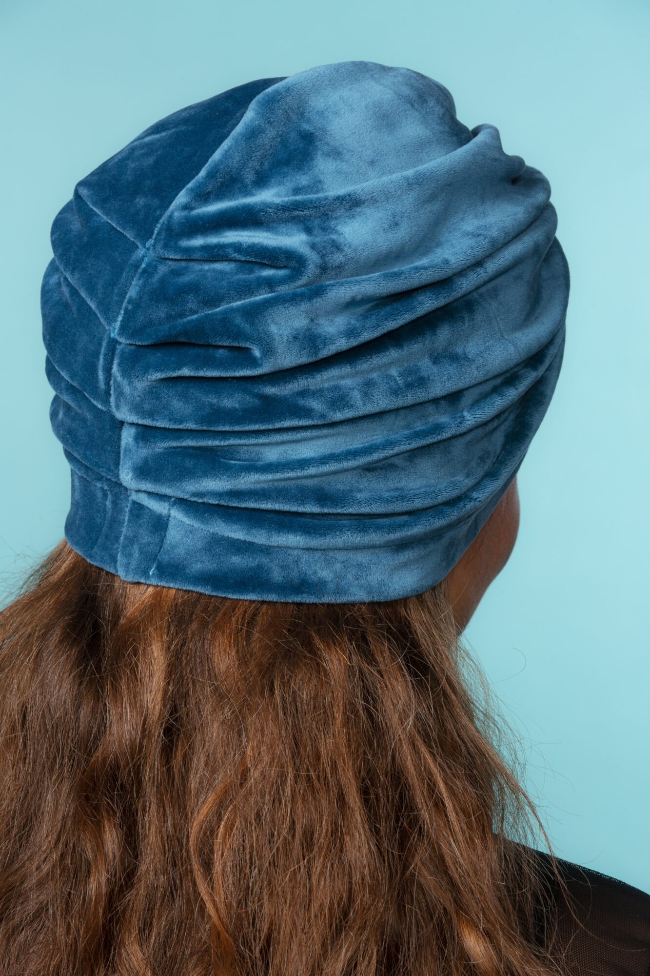 Ylellinen samettiturbaani kruunaa asusi! Turbaanin kangas on joustavaa veluuria Turbaanin takana on kauniit muotolaskostukset.